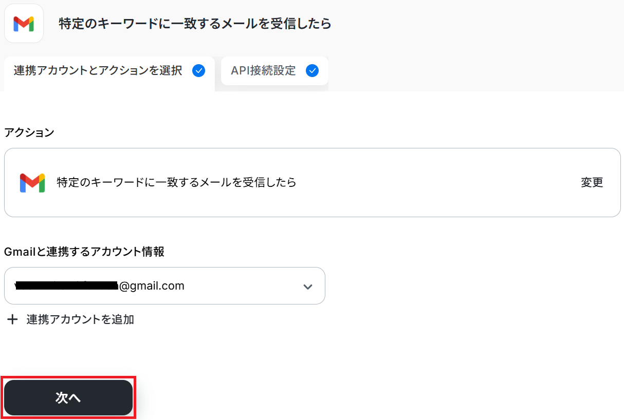 タイトル と連携するアカウント情報 を任意で設定し、アクションはテンプレート通りに「特定のキーワードに一致するメールを受信したら」のまま「次へ」をクリックします。