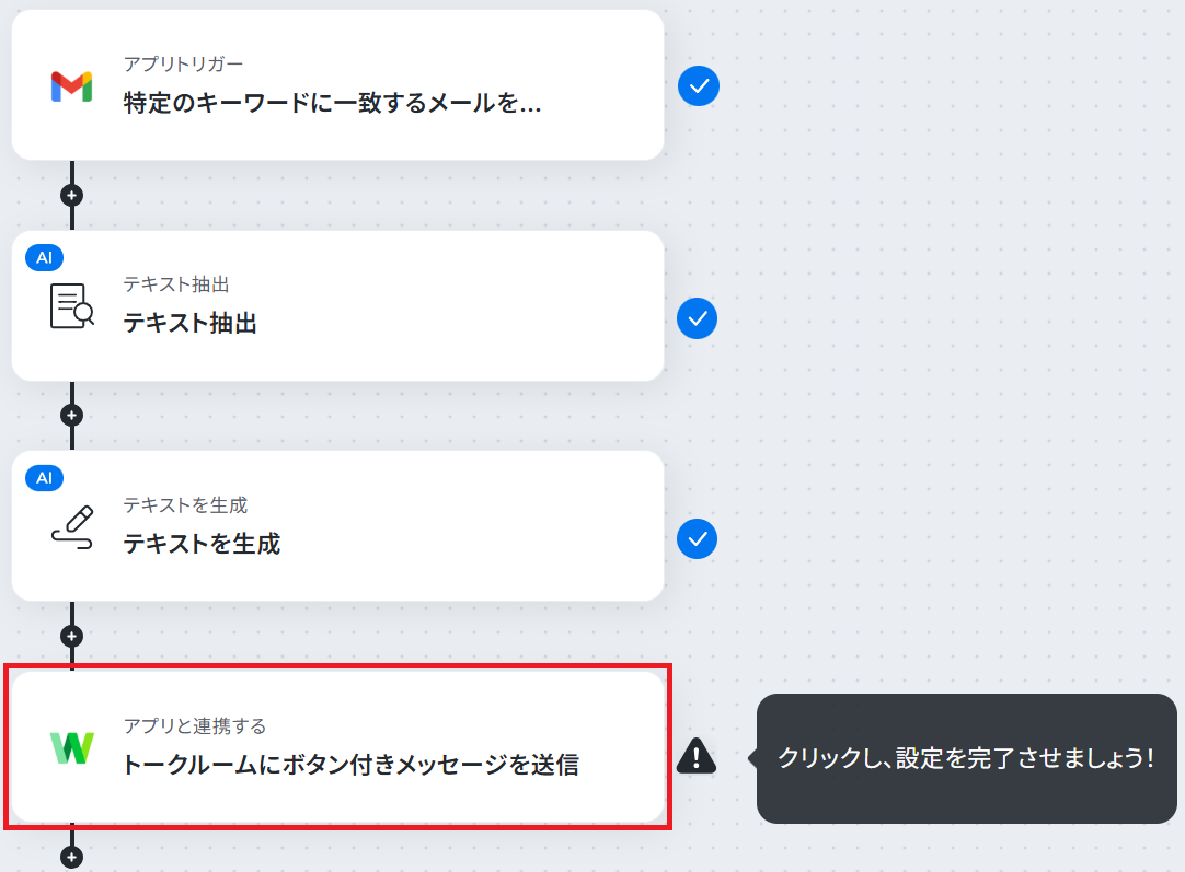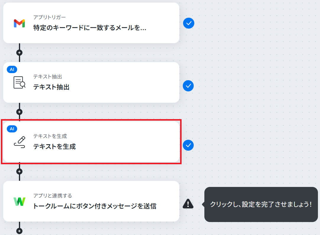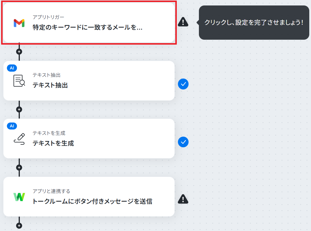 Gmailのトリガー設定、テキスト抽出・テキスト生成・LINE WORKSのアクション設定
