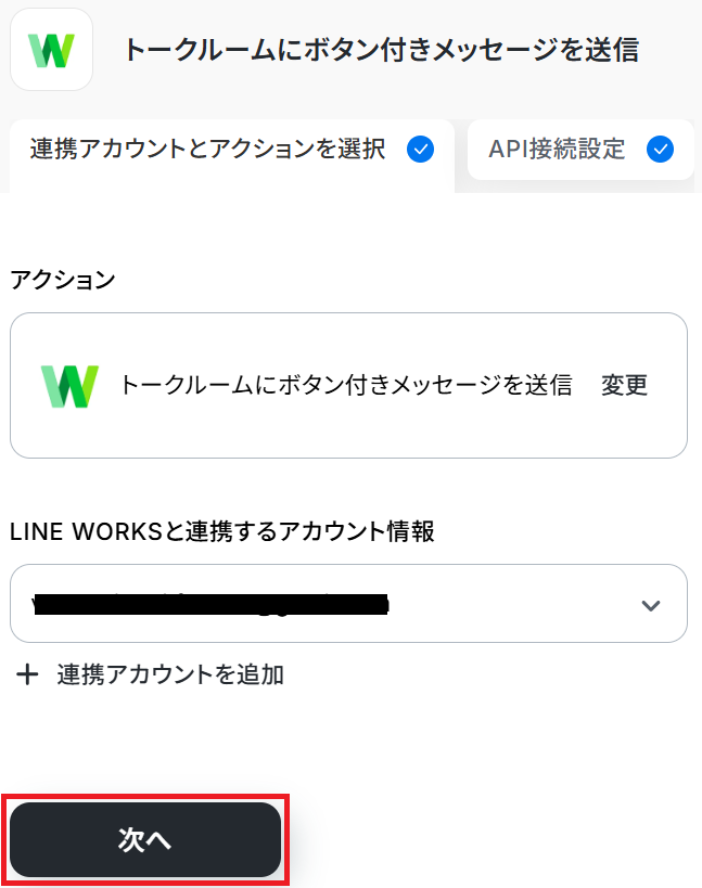 ステップ3と同様、アクションは「トークルームにボタン付きメッセージを送信」のまま「次へ」をクリックします。