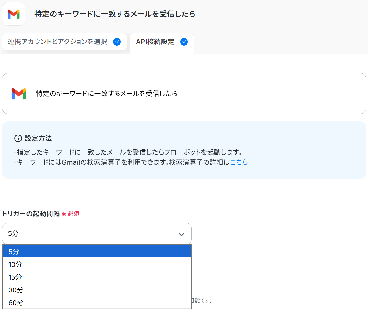 ※5分、10分、15分、30分、60分のいずれかで設定できます。ご利用プラン によって、設定できるトリガーの最短間隔が違うので、その点は要チェックです。 なお、基本的にはそのプランの最短の起動間隔にしてお使いいただくことをおすすめします。