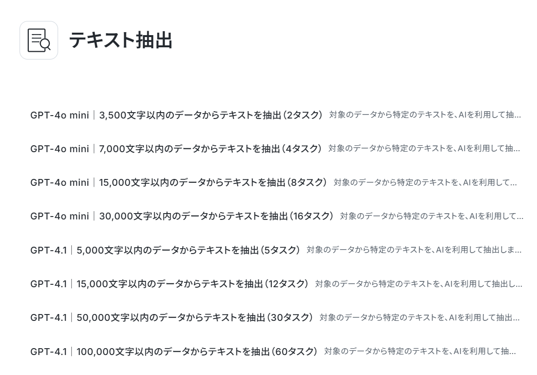 テキスト抽出機能のアクションは以下の種類がありますので、扱う文章の長さに合わせて選択しましょう。 ()内のタスクを消費しますので、使用プランやデータの容量によって選択してください。