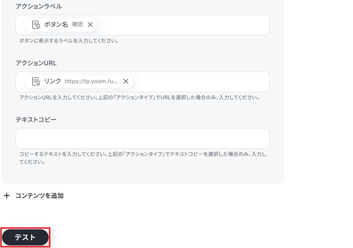 アクションラベル とアクションURL の欄には、ステップ4で抽出した値が既に設定されているのでそのままでOKです。テキストコピー は空欄でテストしてください。
