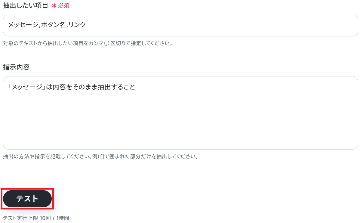 抽出したい項目 も設定されていますが、編集・追加する場合はカンマ区切りで入力しましょう。 最後に、任意で指示内容 を入力してテストしてください。