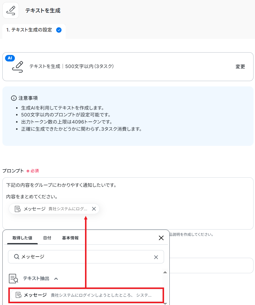 ステップ5:テキスト生成設定 先ほど抽出した「メッセージ」の文章を要約します。「テキストを生成」をクリックしましょう。