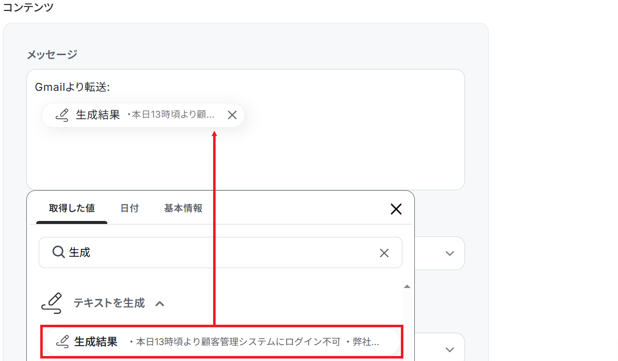 ここから、コンテンツ の設定をしていきます。メッセージ の欄は、固定のテキストやステップ5で取得した値を組み合わせてカスタマイズできます。