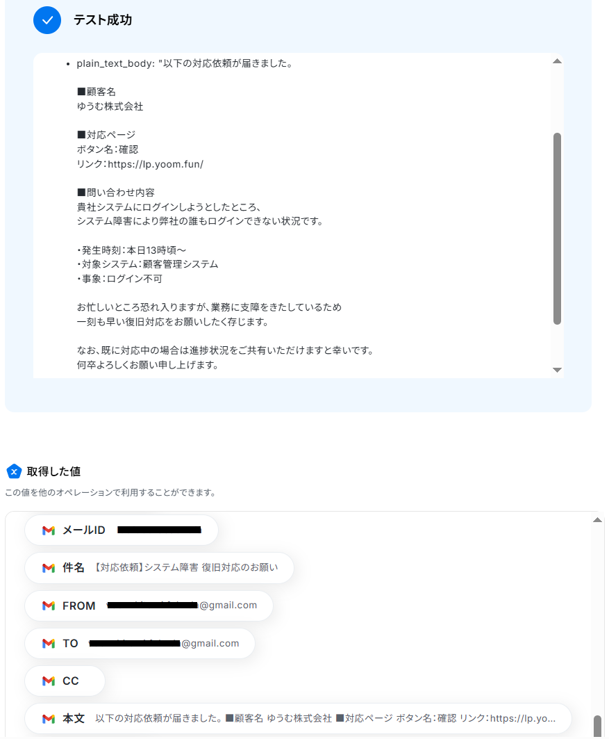 ※以下のように取得した値を設定することで、トリガーが実行されるたびに最新のメール本文を反映できます。