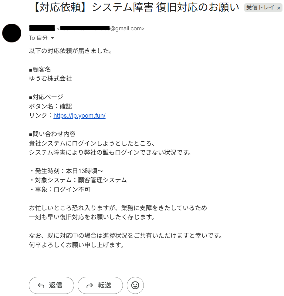 続けて連携したGmailアドレスに、先ほど決めたキーワードを含むテストメールを送信しましょう。 今回は例として問い合わせ管理システムから送信されるメールを想定し、以下のようなメールを作成しました。