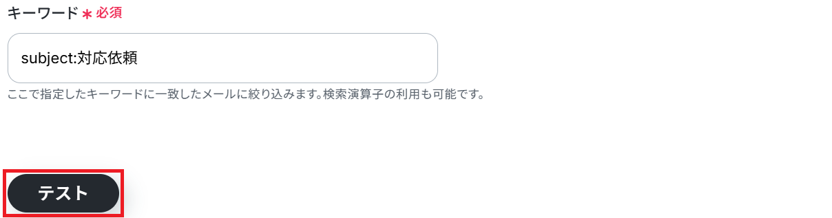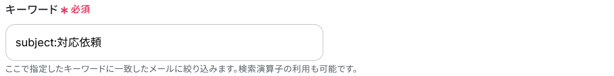次に、フローボットを起動するためのキーワード を設定しましょう。 今回は、件名の単語やフレーズでメールを検索する「subject:」という演算子を使っています。