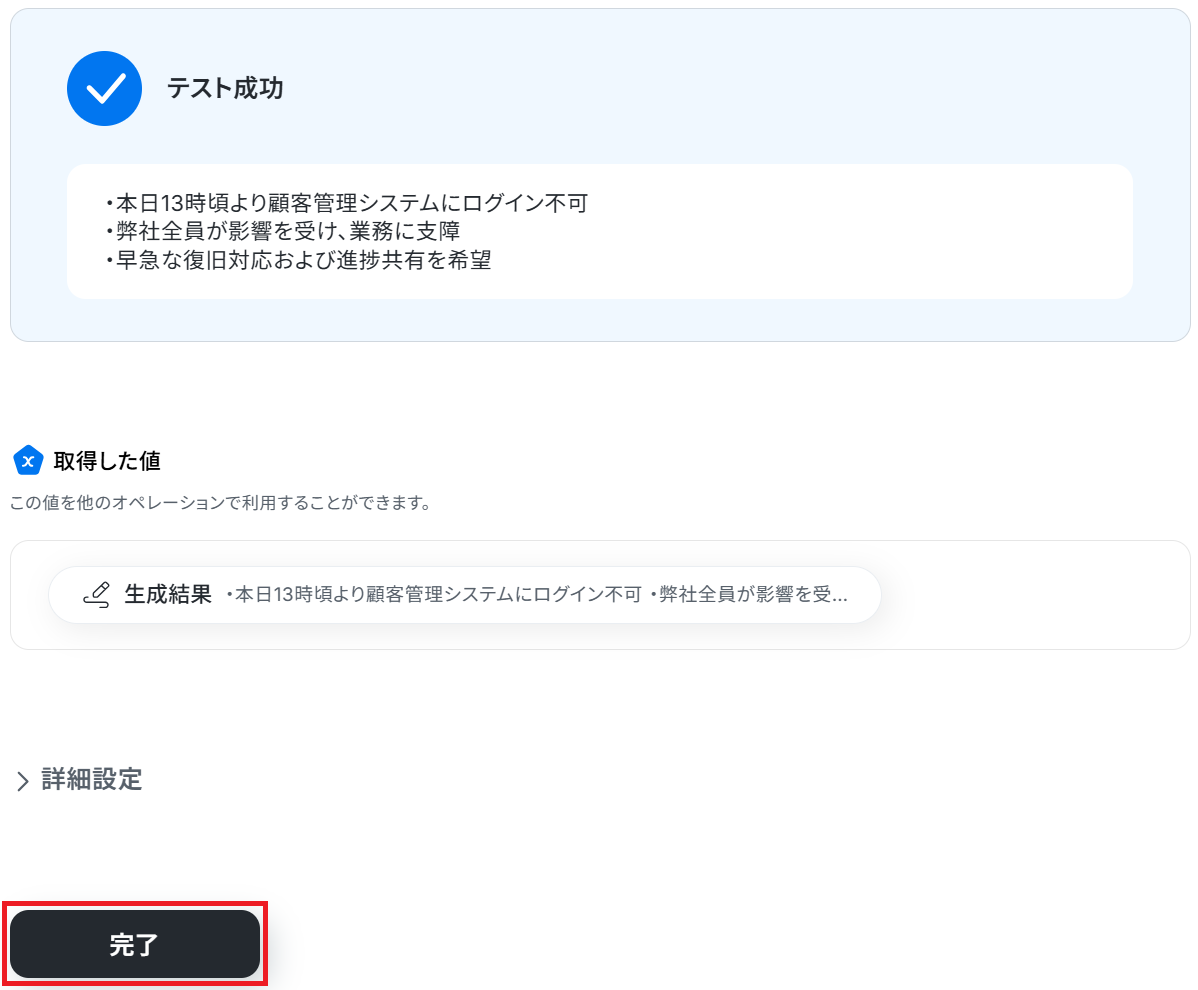 成功したら保存してください。 ステップ4で抽出した「メッセージ」の文章を、AIが要約してくれました!