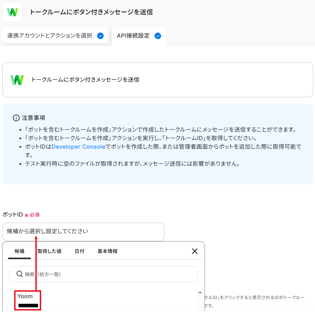 まず、トークルームに招待したBotのボットID を候補から選択してください。