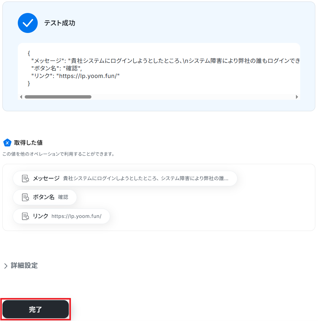 ここまで完了したらYoomの設定画面に戻りテストしてください。
