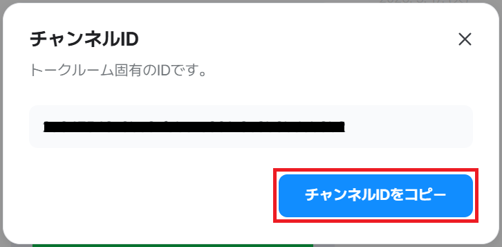 すると以下のようなポップアップ画面が表示され、チャンネルID(トークルームID )をコピーできます。