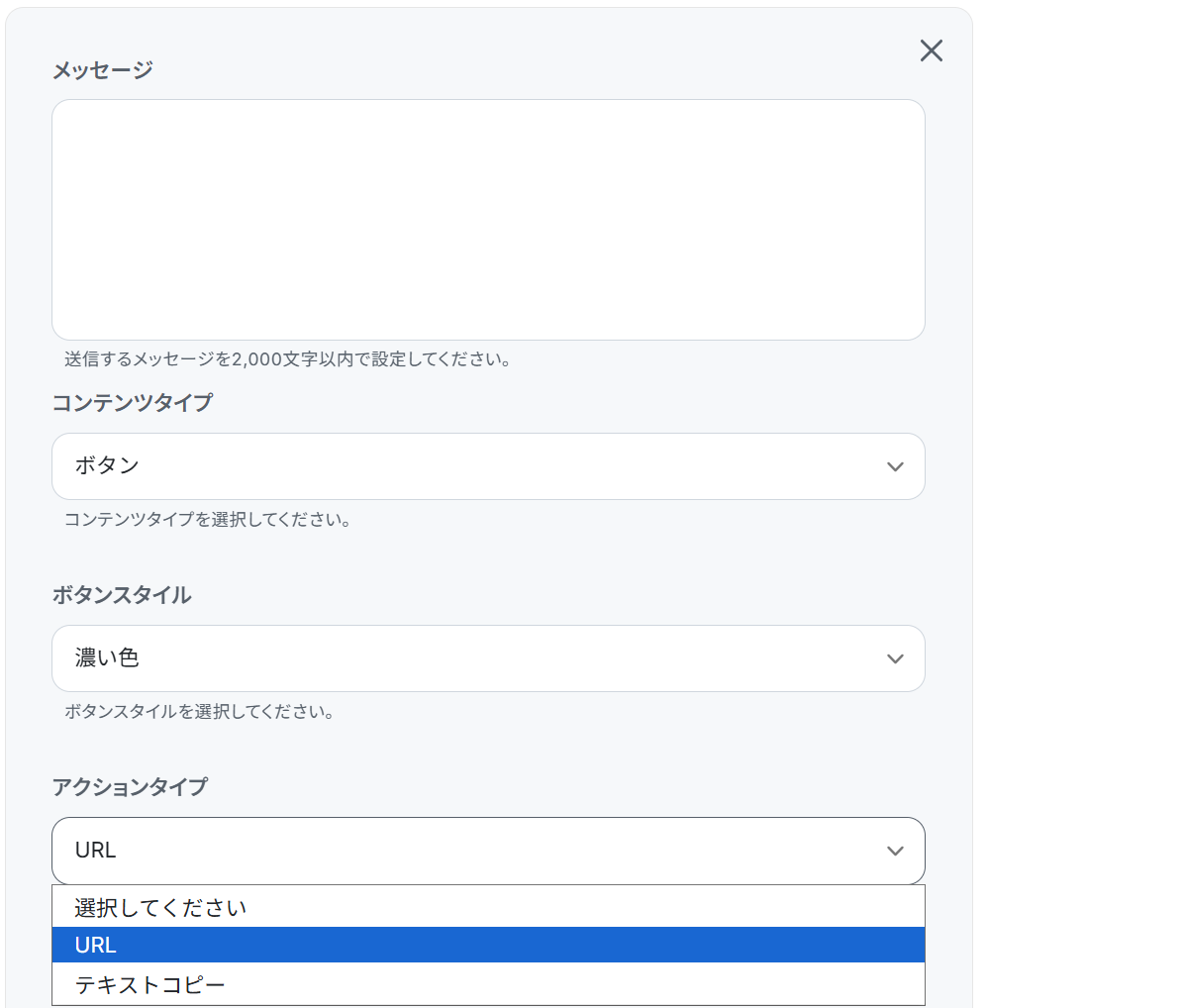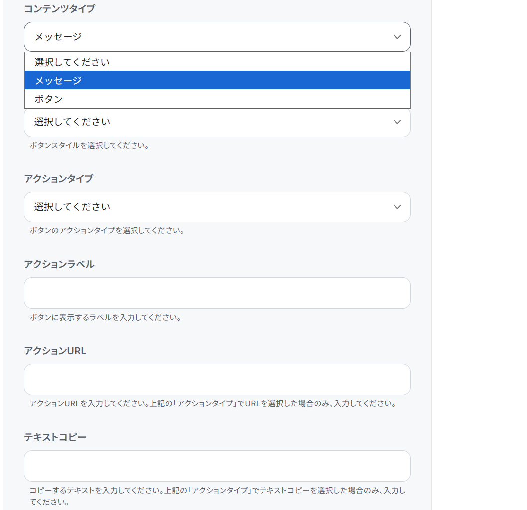コンテンツタイプ は「メッセージ」を選択し、それ以降は空欄にしておいてください。