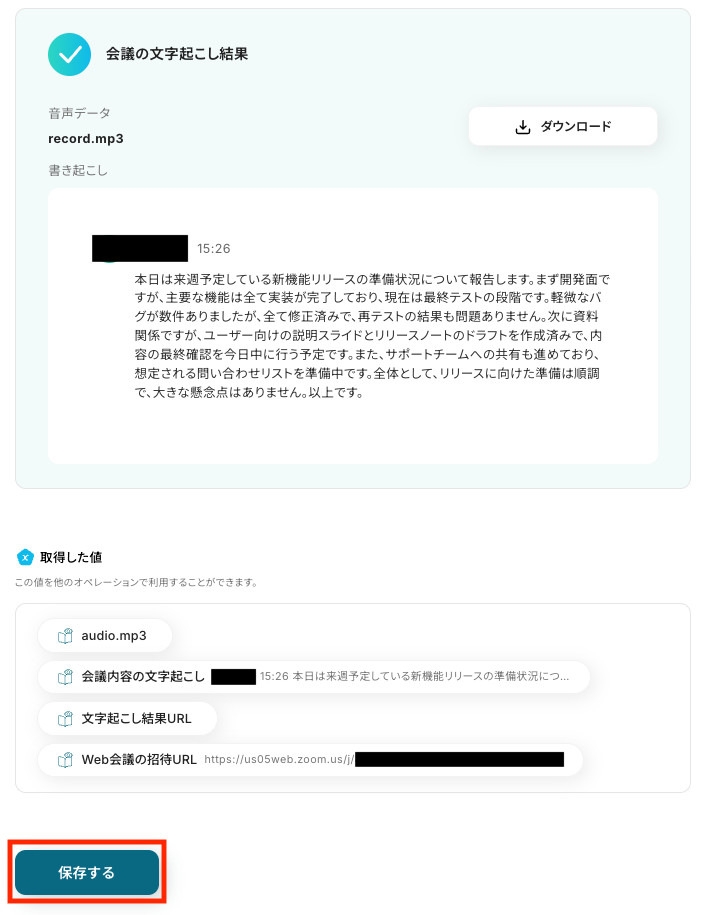 その後、自動で文字起こしが開始され、以下のように取得した結果が表示されます。