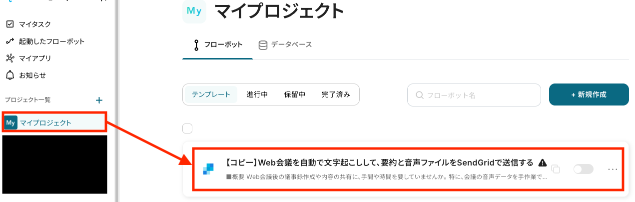 マイプロジェクトから、「【コピー】Web会議を自動で文字起こしして、要約と音声ファイルをSendGridで送信する」を選んでください。