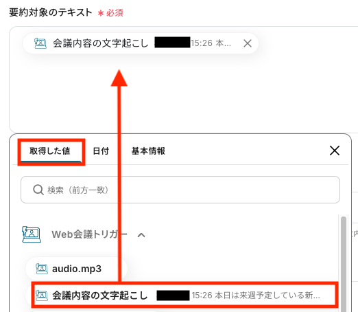 もし空欄の場合は、入力欄をクリックして「取得した値」タブを開き、「Web会議トリガー」内にある「会議内容の文字起こし」を選択してください。