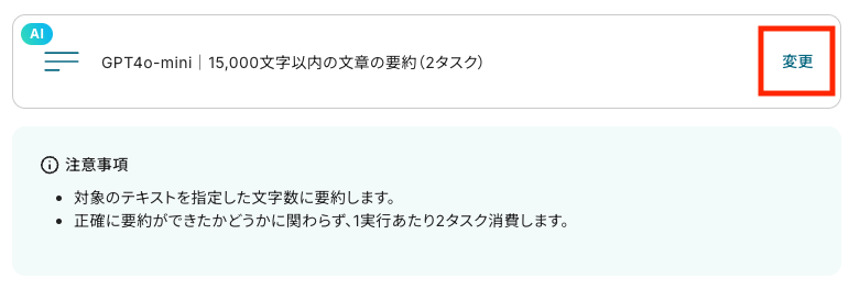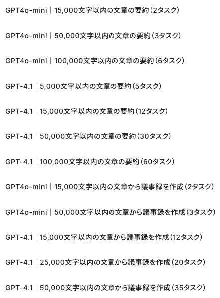 デフォルトでは、「GPT4o-mini|15,000文字以内の文章の要約(2タスク)」が選択されています。