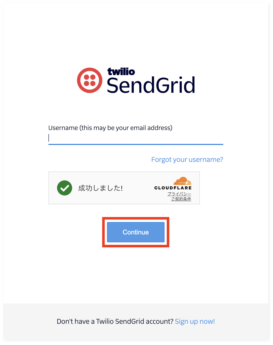 はじめに、SendGridのログインページを開き、ユーザー名を入力して「Continue」をクリックします。
