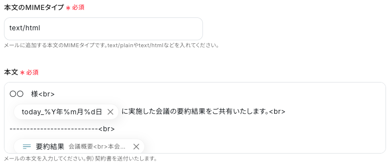 なお、MIMEタイプが「text/html」の場合、改行したい箇所に「<br>」を入れると整った形で表示されます。