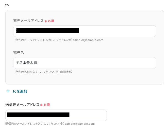 to(宛先)には、送信先のメールアドレスと宛先名を入力します。