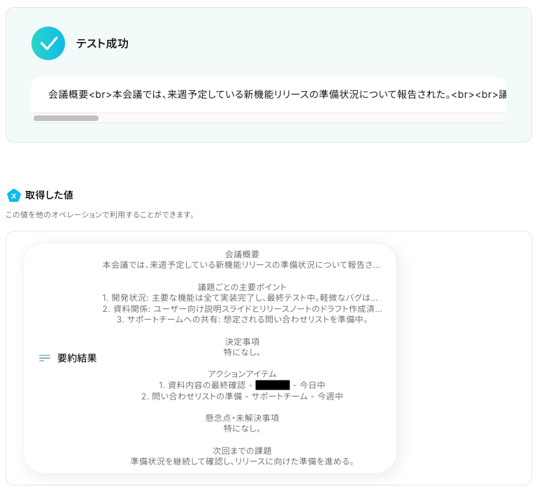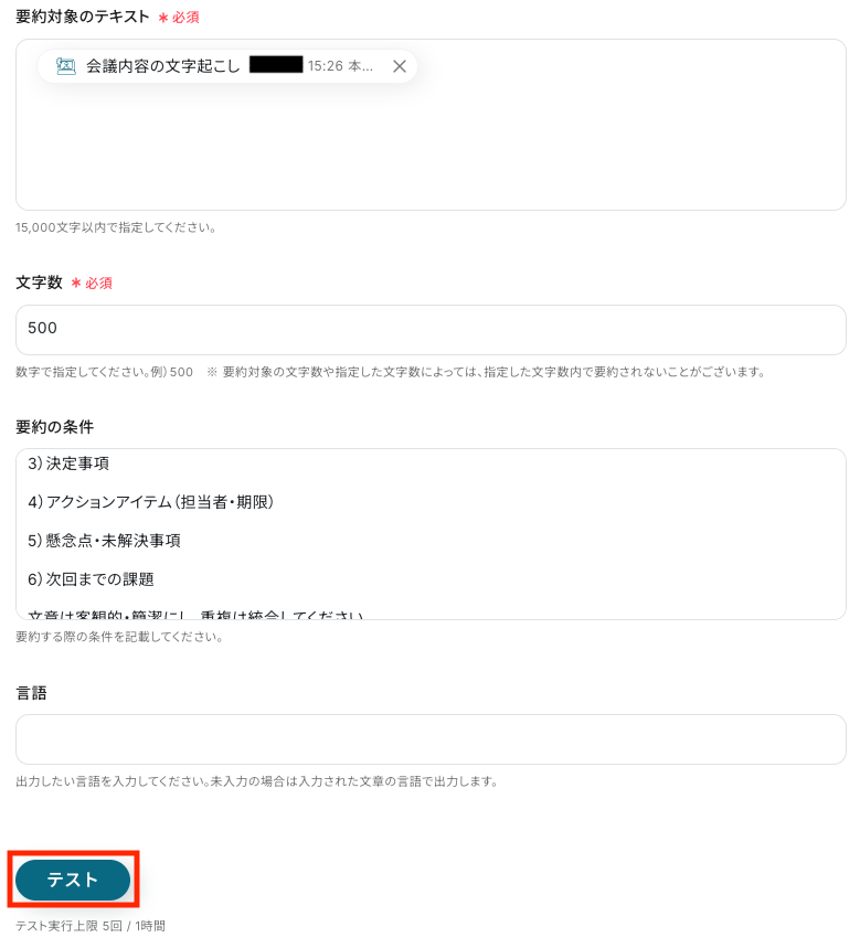 このステップでは、会議の文字起こしデータをAIで要約する設定を行います。