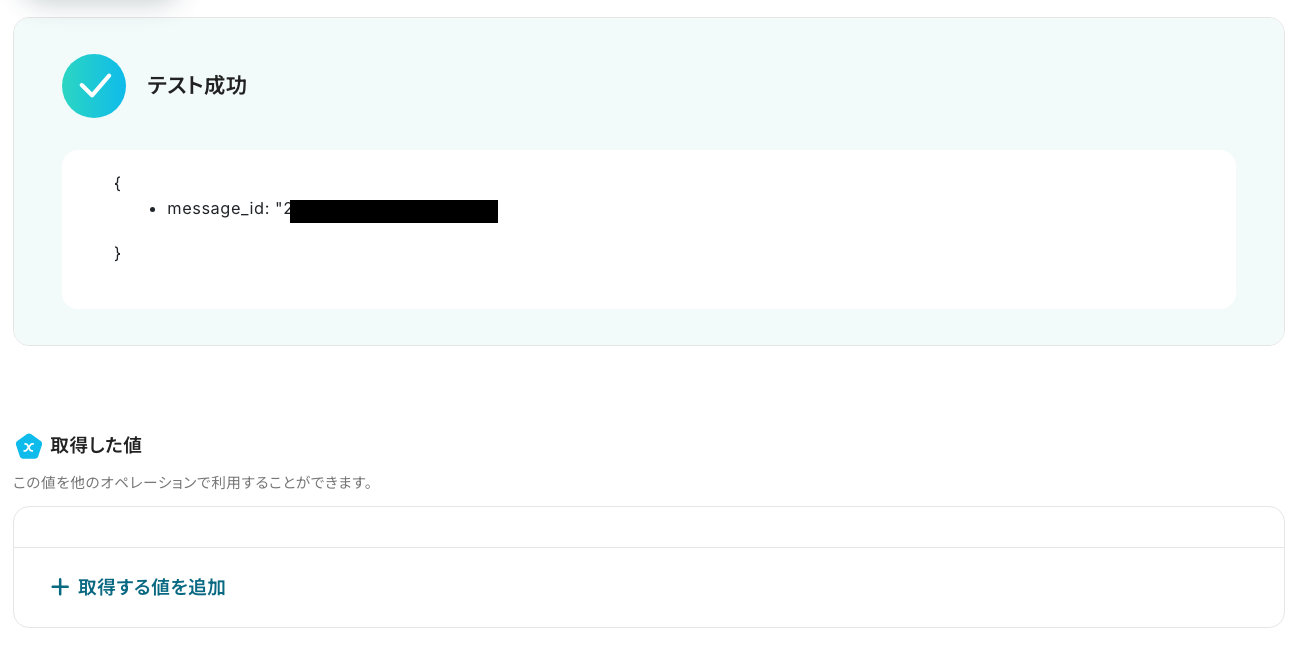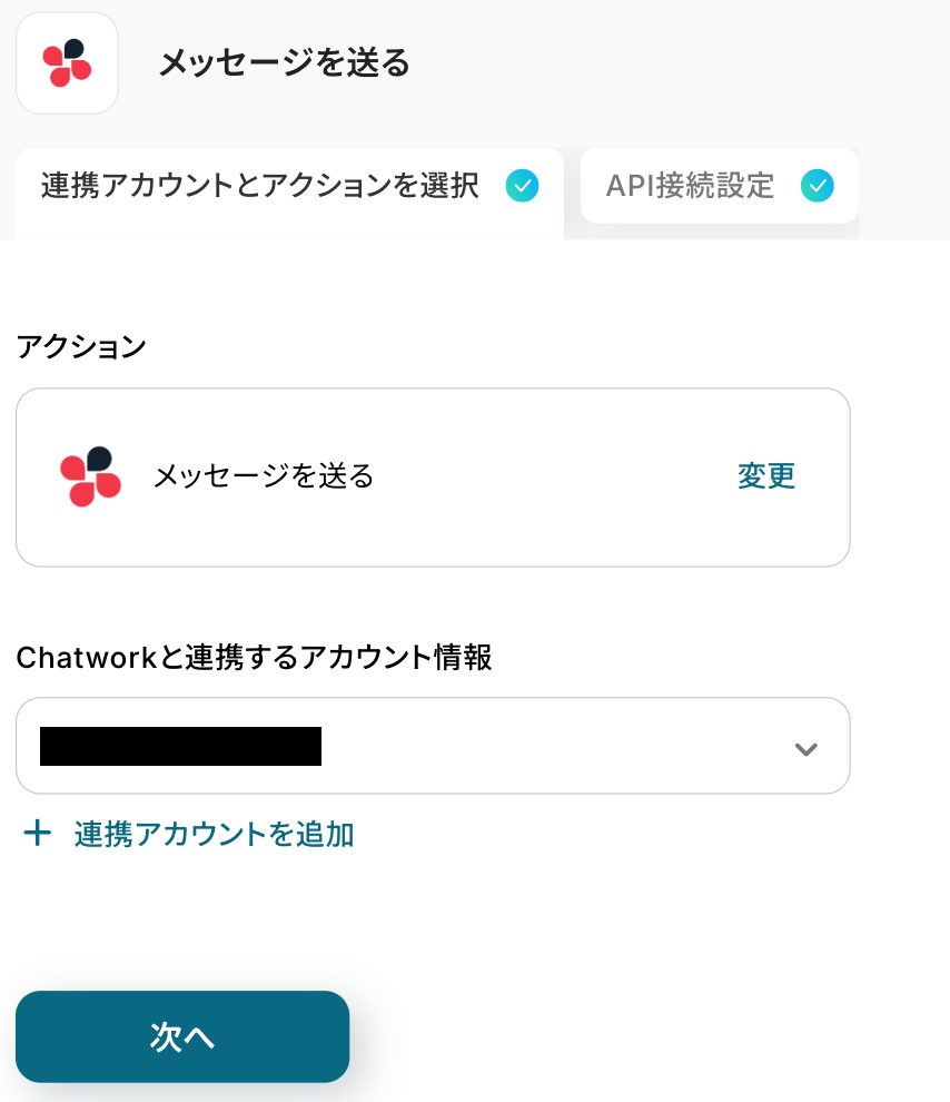 - 最後に、Chatworkの「メッセージを送る」アクションを設定し、翻訳されたテキストを指定のチャットルームに送信します。