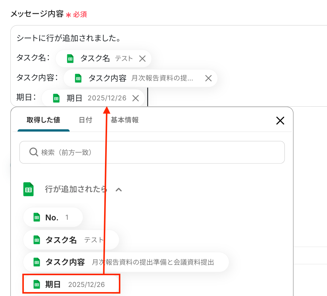 「メッセージ内容」は、注釈を参照し、Chatworkに通知するメッセージを作成してください。