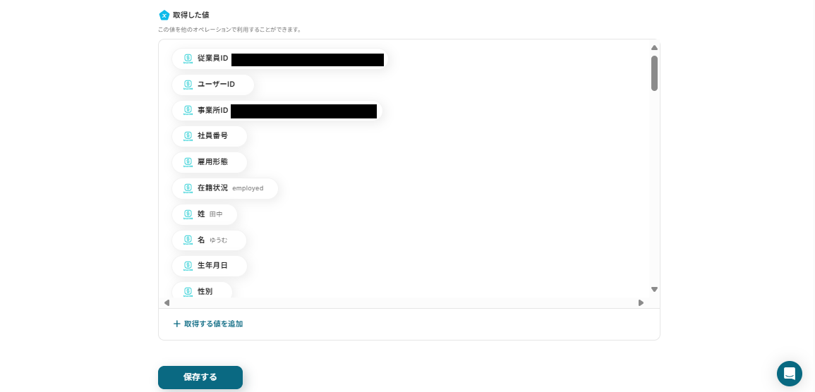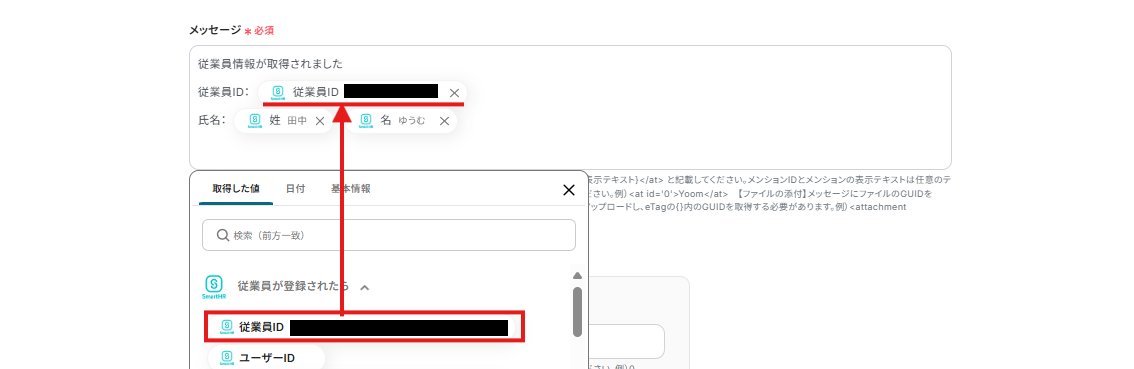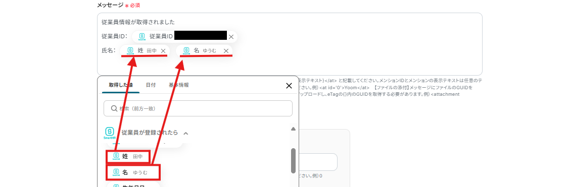 例えば、下記画像のように設定するとSmartHRに新しい従業員情報が登録されたら、自動で「従業員ID」、「姓」、「名」を取得し、Microsoft Teamsに通知することができますよ!