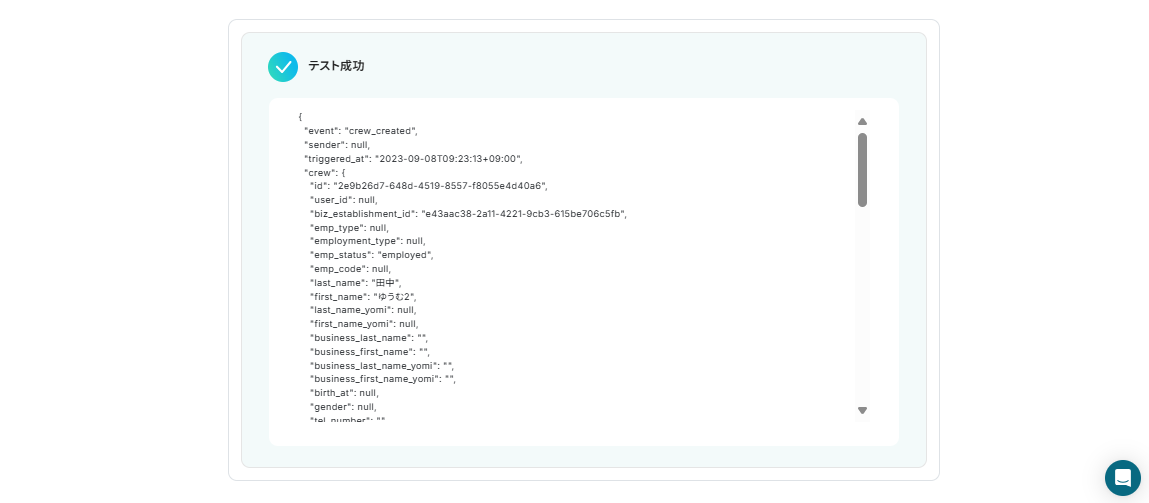 「テスト」を実行し、テストが成功すると先ほど作成した従業員情報がアウトプットに表示されます。