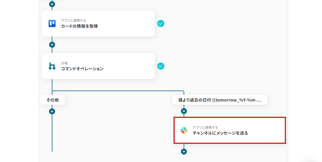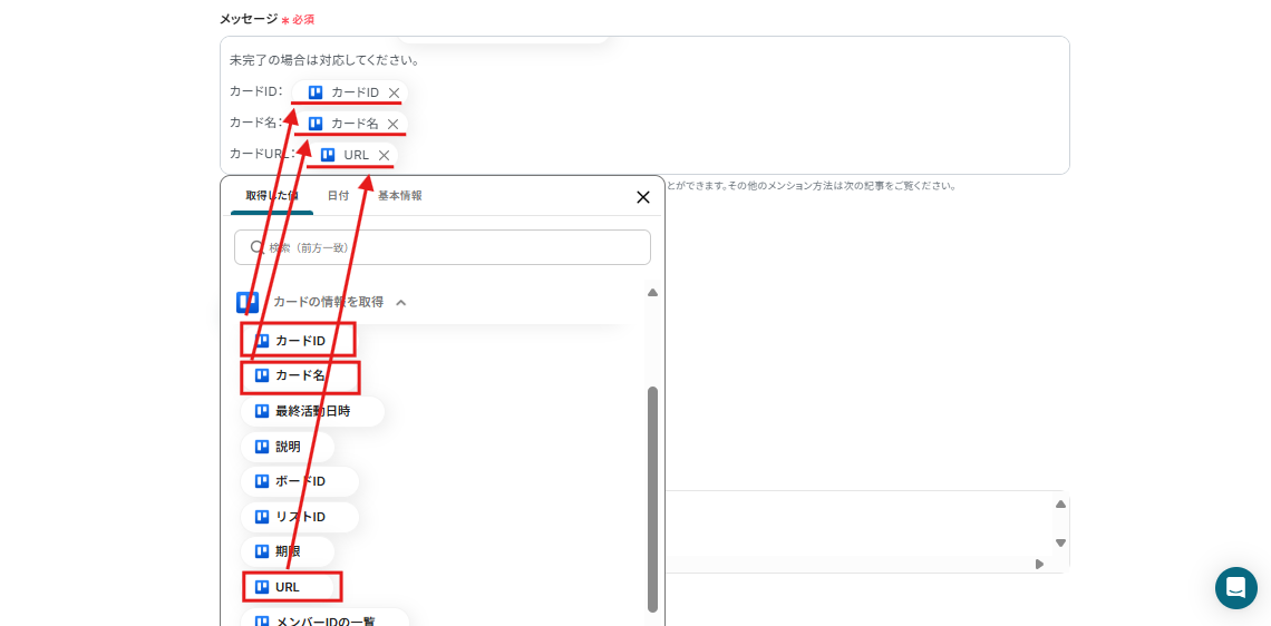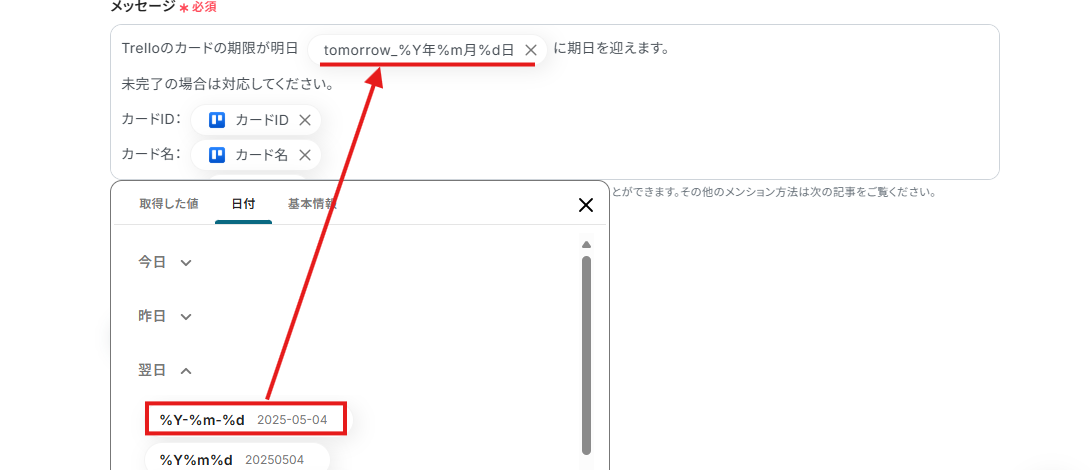 メッセージは自由に設定できます。 例えば下記画面のように設定することで、Trelloのカード期限前日になったら自動で「明日の日付」と対象の「カードID」「カード名」を取得して、Slackにメッセージを送ることができますよ! 用途に合わせてメッセージの内容や取得するアウトプットを変更してご利用ください。