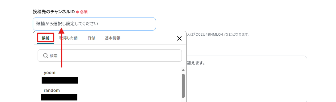 投稿先のチャンネルIDは、編集欄をクリックすると候補が表示されるので任意で選択しましょう。