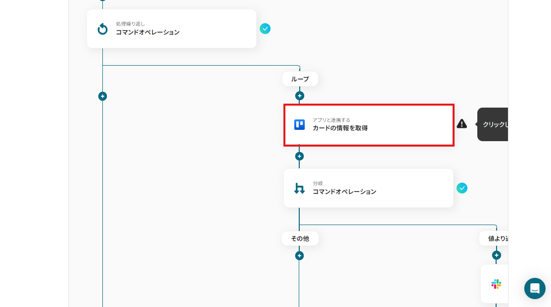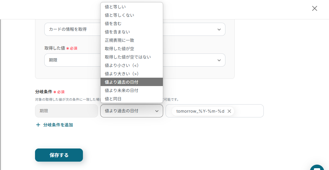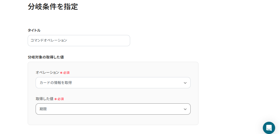 タイトルは、変更可能です。 分岐対象の取得した値は、下記画面の通りカードに登録された「期限」から分岐条件が設定できるようにしてあります。