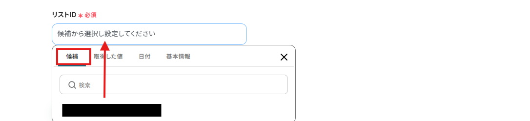リストIDは、下記画面のように表示される候補から選択し設定しましょう。