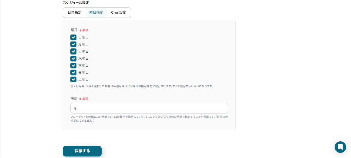 変更の必要が無ければ、そのまま「保存する」ボタンを押してください。 尚、Cron設定を使用すると、実行頻度をさらに細かく調整することができます。 参照:Cron設定の方法は、こちら のページをご確認ください!
