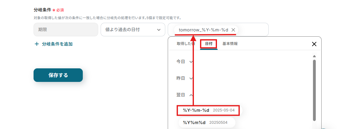 分岐条件は、デフォルトで期限前日に設定されています。 こちらは変更可能なため、用途に合わせて変更して使用してください!