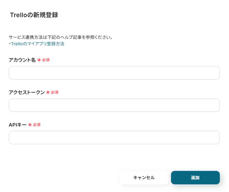 Trelloの新規登録画面に戻り、先ほどコピーしたアクセストークンとAPIキーをペーストします。 「追加」ボタンをおしたら、Trelloのマイアプリ連携完了です! ※設定方法詳細は、こちらのヘルプページ をご覧ください。