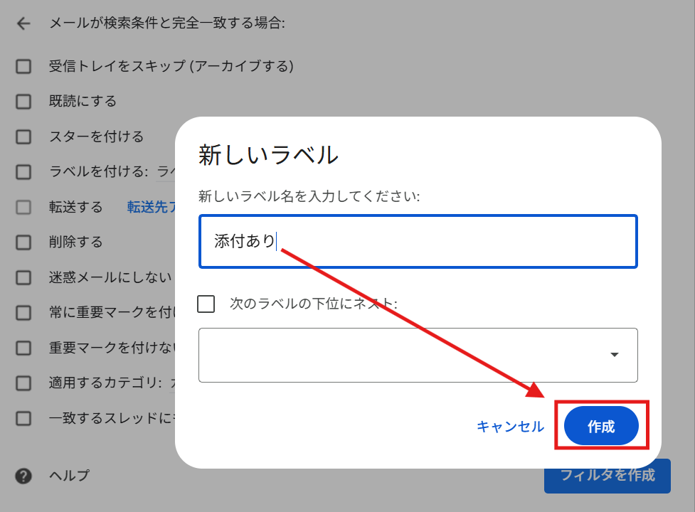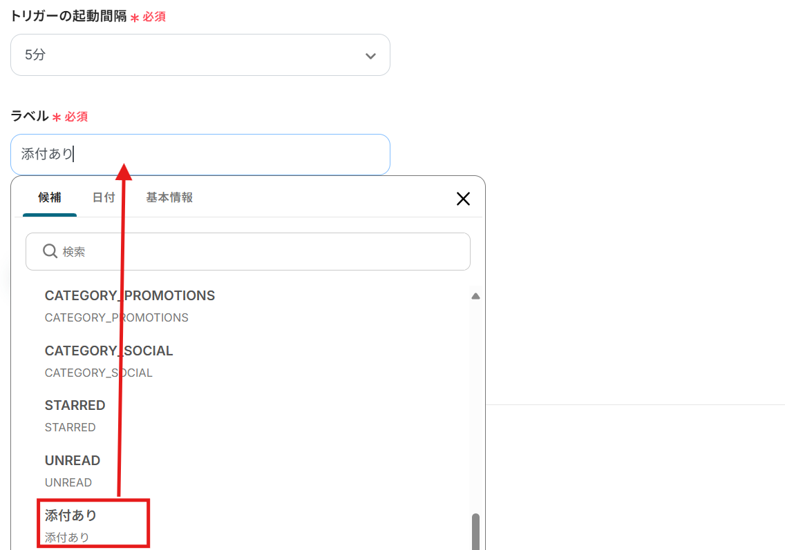 ラベル :先ほど設定した「添付あり」を候補から選択します。