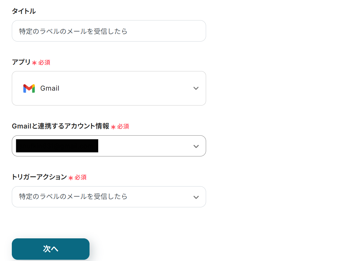 こちらもタイトルと連携するアカウント情報を任意で設定し、アクションはテンプレート通りのまま「次へ」をクリックして進んでください。