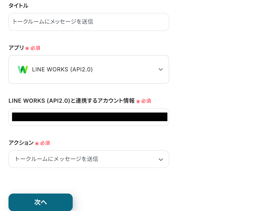 タイトルと連携するアカウント情報を任意で設定し、アクションはテンプレート通りのまま「次へ」をクリックして進んでください。