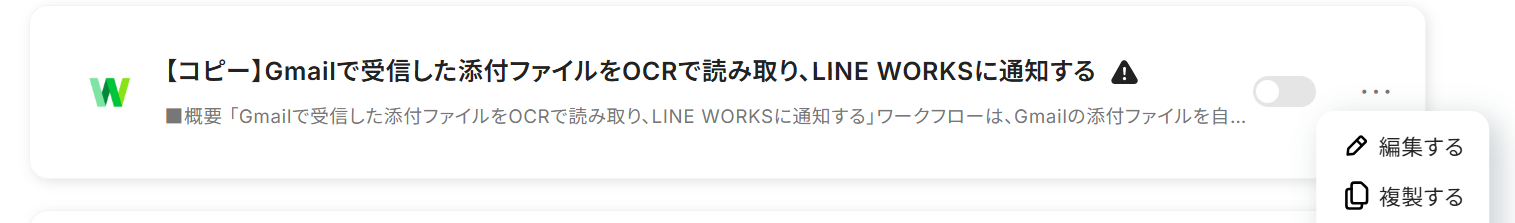 以下の画像が表示されたら、トリガーをONにしてください。 これですべての設定が完了したので、Gmailで受信した添付ファイルをOCRで読み取り、LINE WORKSに通知されるかを確認してみましょう。