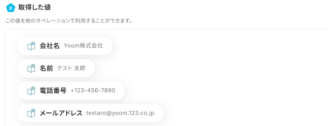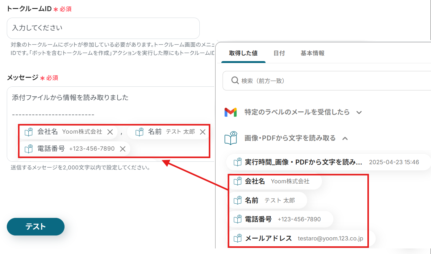 メッセージ :下記のように設定します。 ※アウトプットから選択した項目は赤枠のように表示されます。 値を引用している印なので、これによってトリガーで取得した値をそのまま利用できます。 読み取り結果を固定値で入力してしまうと毎回それが通知されてしまうので、トリガーから取得した項目は必ずアウトプットから選択してください。