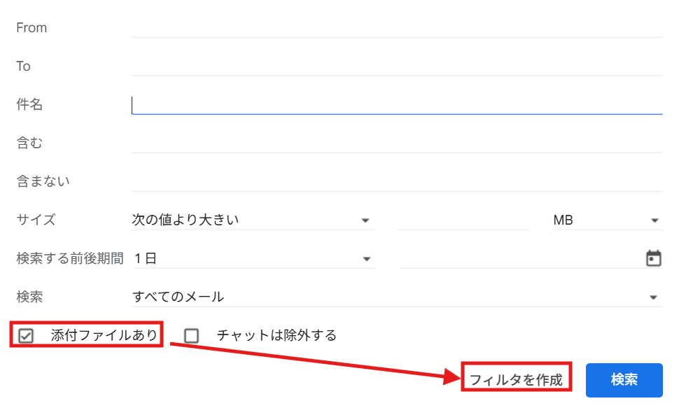 添付ファイルアリをチェックし、フィルタを作成します。 このように設定することで、添付ファイルが含まれている場合に分類できるようになります。