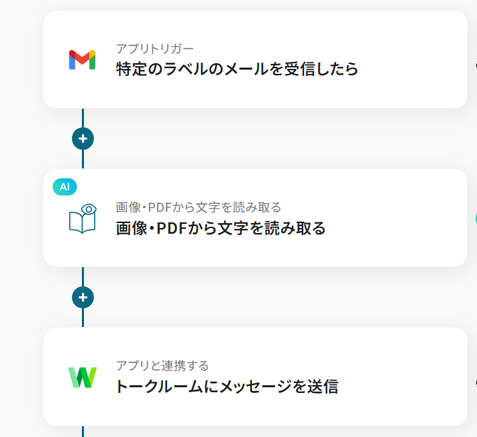 ここでは例として、「Gmailで受信した添付ファイルをOCRで読み取り、LINE WORKSに通知する」フローの作成手順の概要を解説します。