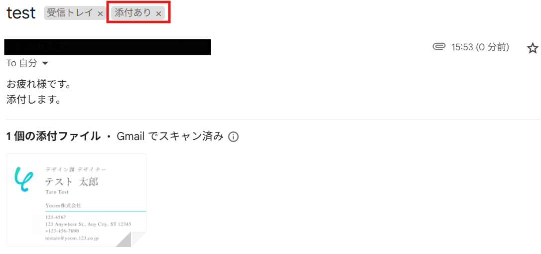 ここでGmailに添付ファイルを付けたテストメールを送信してみましょう。 ラベル付けできると下記の赤枠表示となります。