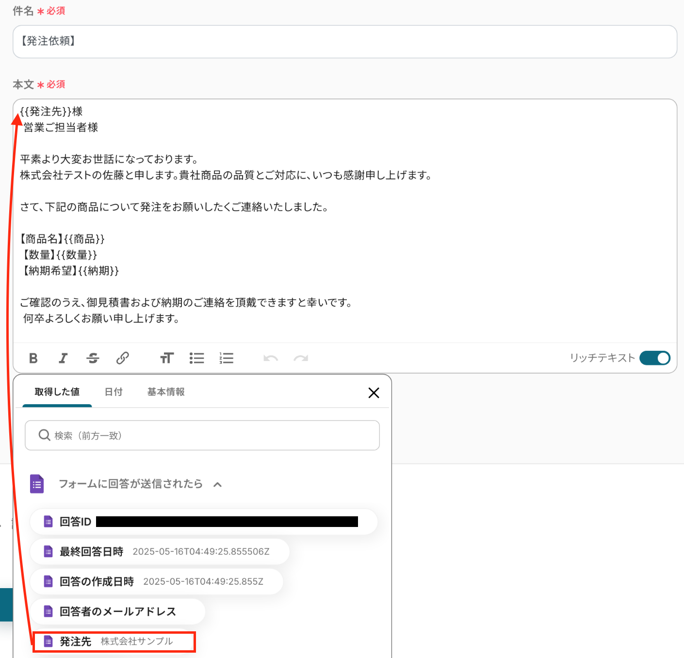 フォーム入力をトリガーにした発注メール自動送信