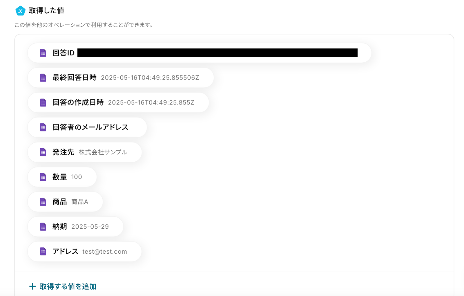 テストが成功すると、以下の画像のようなアウトプット(取得した値)が表示されます。
