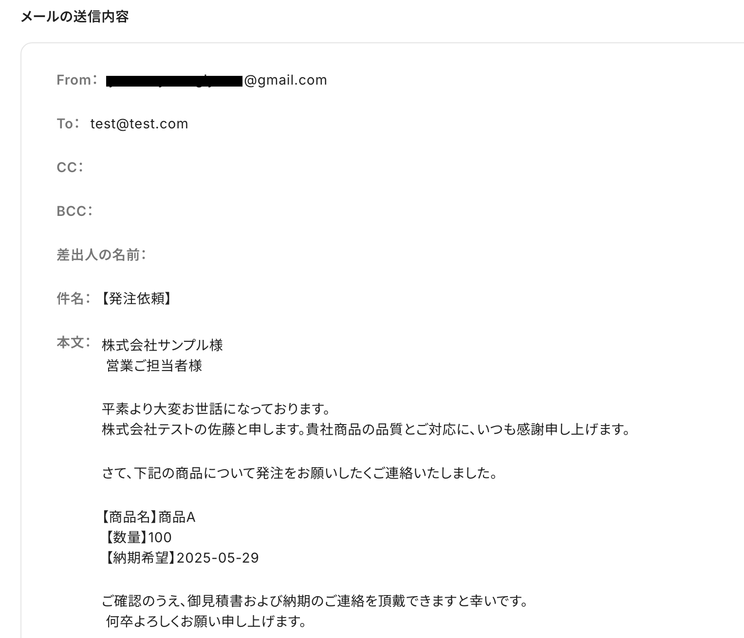 フォームに入力された内容をもとに、自動でメールを作成・送信できるため、手作業の手間がなくなり、入力ミスなどの人為的なミスを防げます。その結果、発注処理が早くなり、業務全体の効率も大きく向上します。