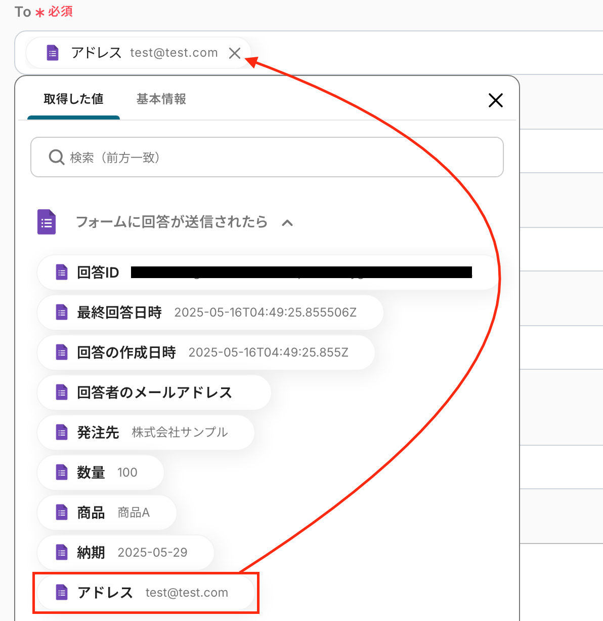 ※フォームに回答されないとテストに成功しませんので、ご注意ください。