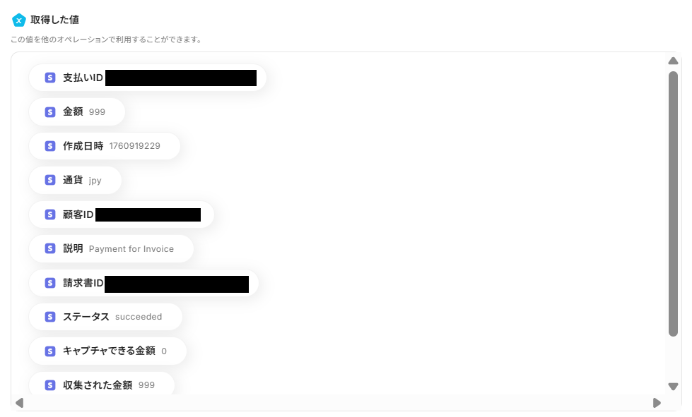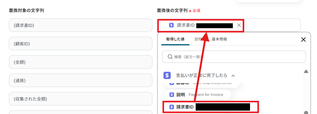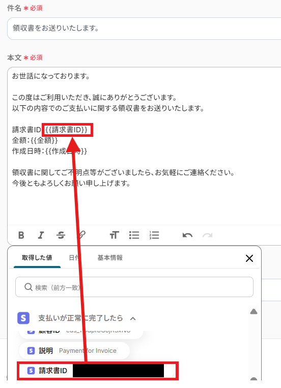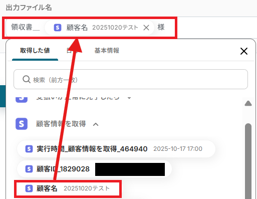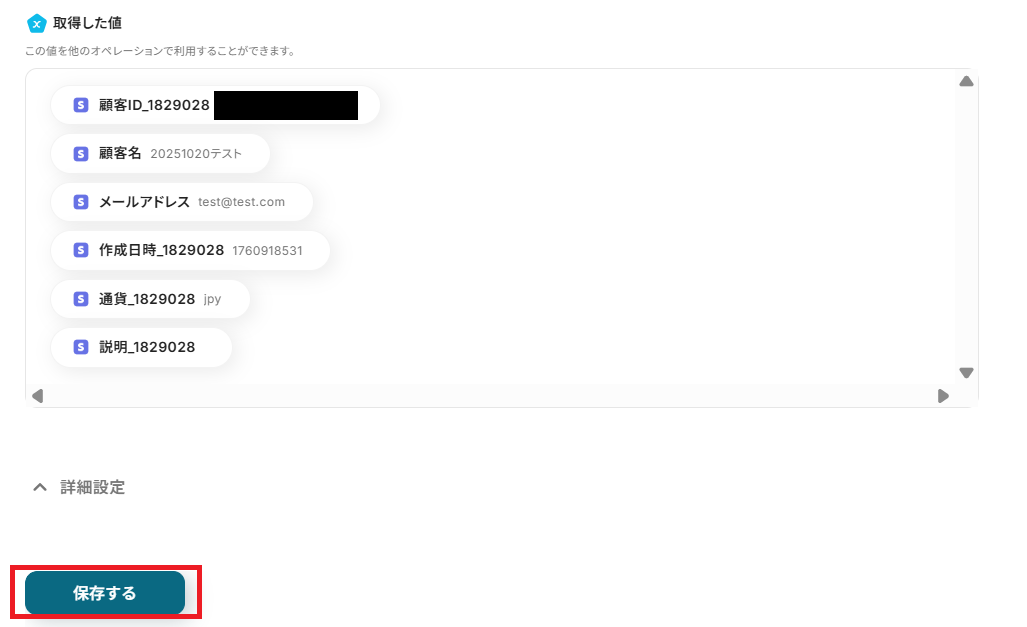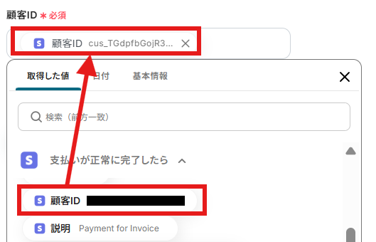 顧客IDは取得した値より入力してください。取得した値を活用することで、固定値ではなく、トリガーが実行されるたびに最新の情報が反映できます。