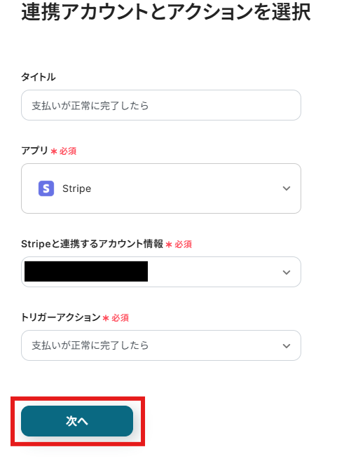 まずはこのフローボットでトリガーになっている、「支払いが正常に完了したら」というアクションを設定していきましょう。